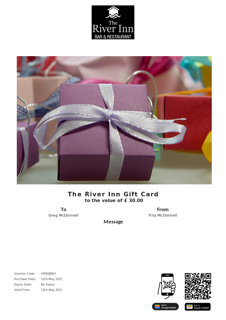 The River Inn allows you to purchase instantly printable gift vouchers, special offers and tickets using the Voucher Connect platform.